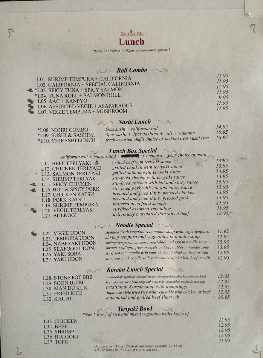 The menu at Sapporo Sushi offers a relaxed, restaurant-style experience featuring a thoughtful mix of classic Japanese and Korean-inspired dishes. You’ll find a variety of casual bites and comforting options, from crisp cucumber salads and warm miso soup to hearty sushi dinners and satisfying stone pot rice bowls.
